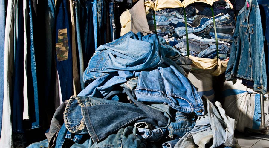 Old jeans are cut apart and sewn into a flat piece of cloth. Then the pattern pieces are strategically placed to use pockets and seams as part of the design element.