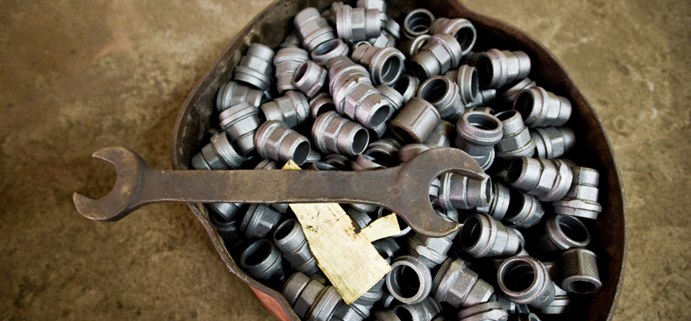After sandblasting each pipefitting to create surface texture, the pieces are placed onto racks. These are then hot dip-plated to galvanize the iron. A final oil and water bath cools and hardens the pipes. Along the way, a quality controller passes the pipe through to the next step, or it’s melted down to begin the process again.